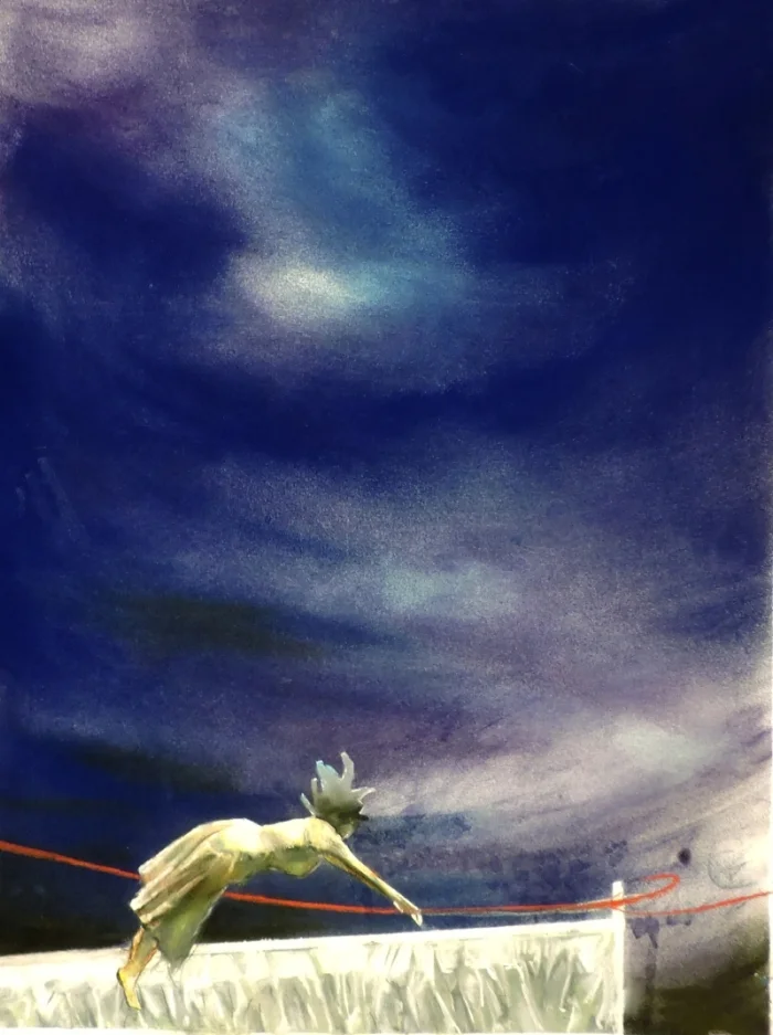 Ladder With Draping Sky, 24”x36”Mixed Media on Paper, 2023