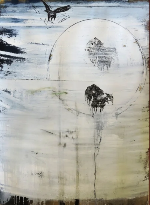 Water and Crow, Mixed Media on Paper, 24”x40”, 2023