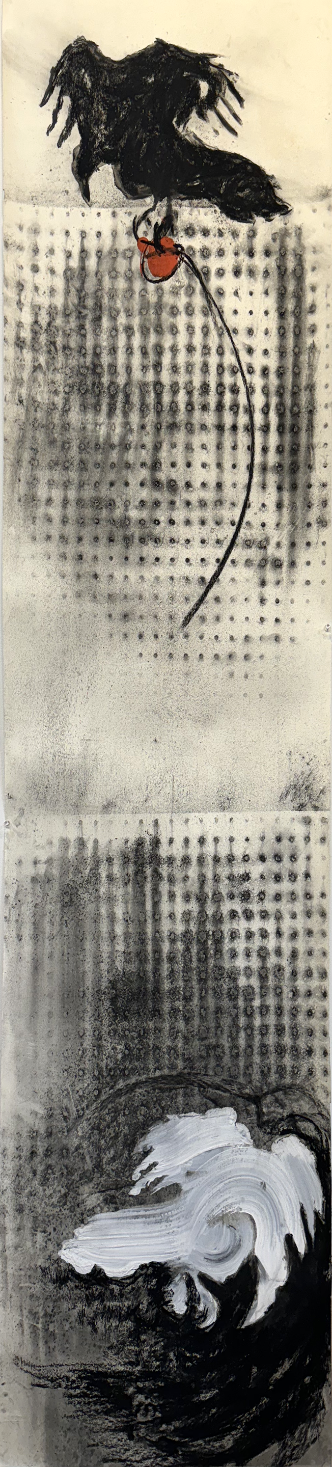 Red Tip Crow, Mixed Media on Paper, 30”x5’ , 2023